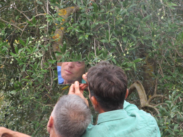 El segundo día del encuentro en plena naturaleza, entre olivos, el arte se volvió cuerpo. Hombres y mujeres bailaban en diferentes partes, cada uno a su modo, sin coreografía, sin ataduras y al son de una música de fondo. Colores flotaban en el aire. Diversas figuras aparecían en el espacio, y los bailarines se dirigían a un solo lugar donde el público los esperaba. De pronto se vio a un hombre de camisa verde caminando de espaldas. En su mano derecha sostenía un espejo cuadrado a la altura de su frente. El público podía observar la mitad de su rostro. Caminaba y caminaba lentamente como si estuviera preguntando ¿De qué espejo está hecha la vida? Fue una escena simbólica. En ese espejo no estaba solo un hombre: estaba también todo el público preguntándose lo mismo.